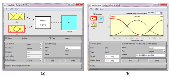 Based on the available samples, the Sugeno algorithm with two inputs and one output was simulated (Figure 14a). As inputs, signs were used in which the ranges of values are divided into three: detect, use, unknown (Figure 14b).