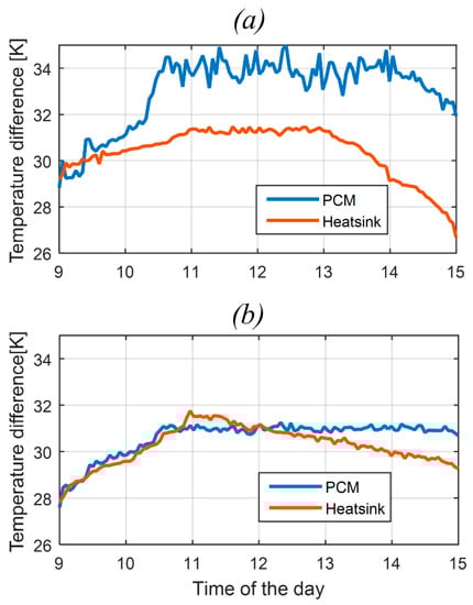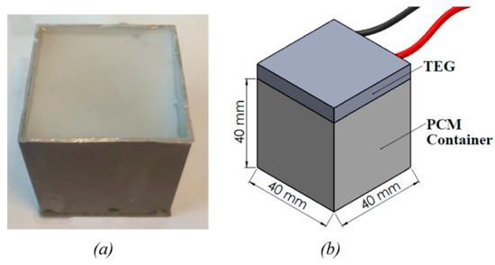 22], an experimental study is carried in heatsinks with and without PCM to evaluate the best configuration for a high-heat electronic-component generation. The results indicate a maximum temperature reduction of 25% with the insertion of PCMs. Regarding TEGs temperature control, in [