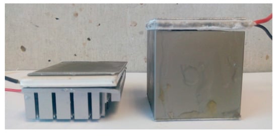 20], the authors propose a prototype that harvests energy from heat using a thermoelectric material. It consists of an array of 12 TEGs connected in both series and parallel. The TEG hot side is exposed directly to the incidence of solar rays, while the cold side is arranged on water, acting as a dissipative material. In this case, the prototype produces an average temperature gradient greater than 15 K. For both arrays, series and parallel, average powers of 1.23 W and 0.43 W are obtained, respectively.