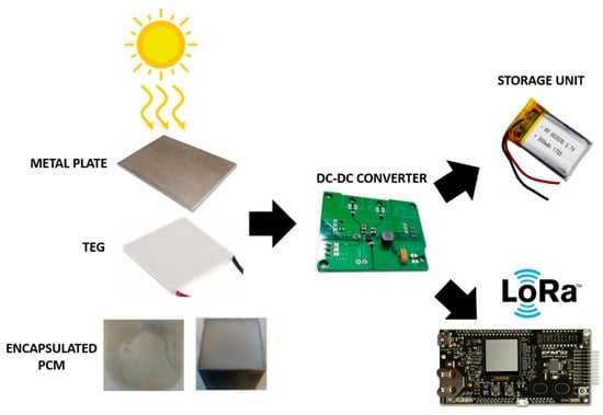 19], the authors present an autonomous multi-sensor system for agricultural applications using a TEG excited with the incidence of solar rays. The TEG cold side is attached to an aluminum heatsink which allows obtaining a maximum temperature of 8 K and a maximum TEG voltage of 200 mW. In [