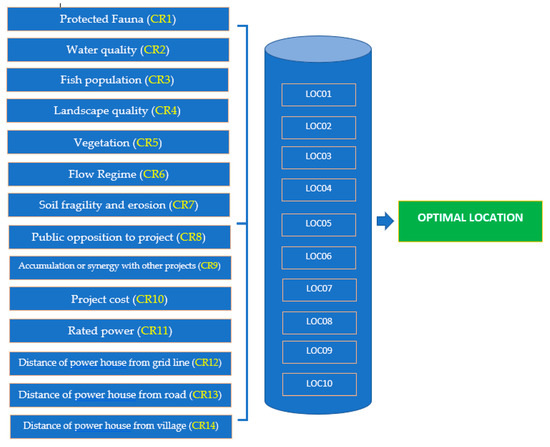 Therefore, to ensure the goal of sustainable hydroelectric production is reached, it is necessary to improve the decision-making process by strengthening coordination among stakeholders, as well as improving quality in the participation of stakeholders. As most of the environmental and social problems of hydroelectric production are directly linked to a plant’s location, it is important that economic, social, and environmental criteria are considered in the hydroelectric dam location selection process. Thus, this decision-making process can be considered as a multi-criteria decision process, in which the decision-maker must consider both qualitative and quantitative factors. In the proposed model, there are fourteen economic, social, and environmental criteria, including: fauna protection, fish population, flow regime, landscape quality, public opposition to project, water quality, vegetation, soil fragility and erosion, accumulation or synergy with other projects, project cost, rated power, distance of power house from grid line, distance of the powerhouse from village, and distance of the powerhouse from road. In the case study, input data were applied to the proposed model, which resulted in Nghe An (LOC05) being the most optimal location from the potential alternatives (Table 5).