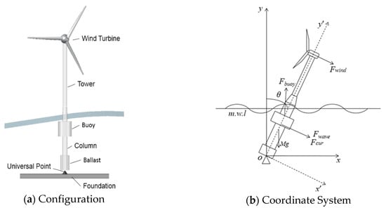 Typically, when we talk about offshore wind turbines, there are two main types of foundation to support them. One kind are fixed foundations, including gravity base, monopile, tripod, and jacket foundations []. These fixed foundations are usually installed in the sea area less than 50 m. In fact, the fixed foundation should bear the environmental and operational loads. When the water depth increases, the bending moment at the seabed increases greatly. In order to resist this large moment, the scale of the structure needs to be increased, causing a substantial increase in the construction and installation cost.
