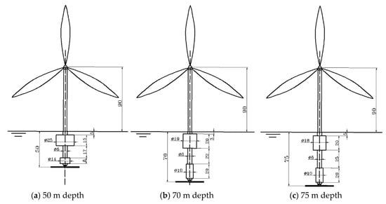 As shown in Figure 1a, the AOWT mainly consists of the NREL 5 MW baseline wind turbine [] and an articulated-tower support foundation. Detailed parameters of the upper wind turbine could be easily found from previous work or other, similar research [,]. On the other hand, the support platform consists of a perforated column, a buoyancy tank, and a ballast tank. The vertical configuration of the articulated foundations is shown in Figure 2. To investigate the dynamic responses of the AOWTs under different water depths, these three main parameters are optimized based on the algorithm from the perspective of motion stability and economy. The main parameters for each foundation are listed in Table 2. More details about this optimization progress could be found in our previous works [,]. Besides, considering the welding of the main structure, subdivision bulkhead, and reinforced aggregate, the equivalent thickness of the foundation is 0.07 m. Hereby, (x, y) is a two-dimensional Cartesian coordinate system with its origin at the bottom of the hinged joint and y pointing upward (see Figure 1b). The x-axis coincides with the direction of the incoming wind and wave.