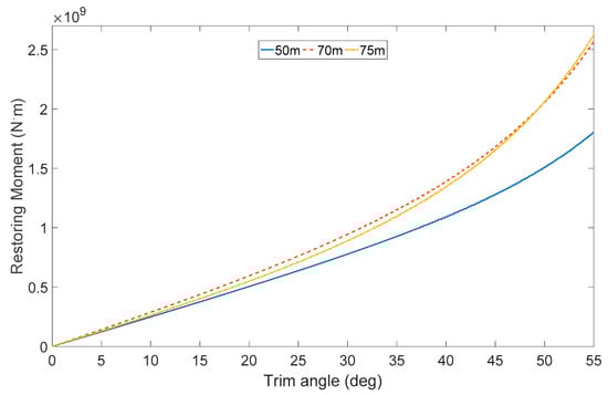 Another interesting phenomenon was found; the restoring moments of the 70 m depth AOWT are larger than those of the other two AOWTs under most trim angles. In fact, according to Equation (4), we found that the restoring moment is determined by two factors, the buoyancy term and the gravity term, including the forces and their corresponding arms. On one hand, comparing with the other two AOWTs, the 50 m one has the shortest righting arm due to the shallowest water depth. Therefore, its restoring moment provided by the foundation is less than other two articulated foundations. On the other hand, because the buoyancy tank diameter of the 70 m depth AOWT is a little larger than the 75 m depth one (see Table 2), the restoring moment is slightly increased by this effect.