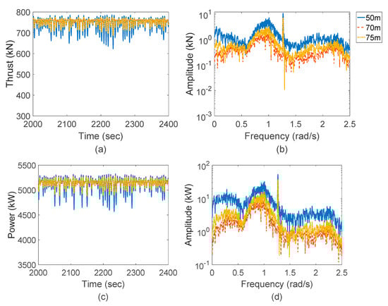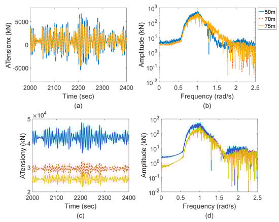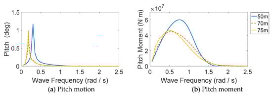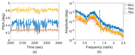 The time history curves and response spectrum of pitch motion are displayed in Figure 7. According to the simulation results, the pitch of AOWT is smaller than that of OC3 Hywind FOWT []. Among different water depths, we can see that the pitch motions differ in both mean position and dynamic oscillation. On one hand, according to the results in Figure 6a and Figure 7a, it can be seen that the average pitch of the 75 m depth AOWT is the largest among the three AOWTs, while the 70 m depth one shows the least average motion.
