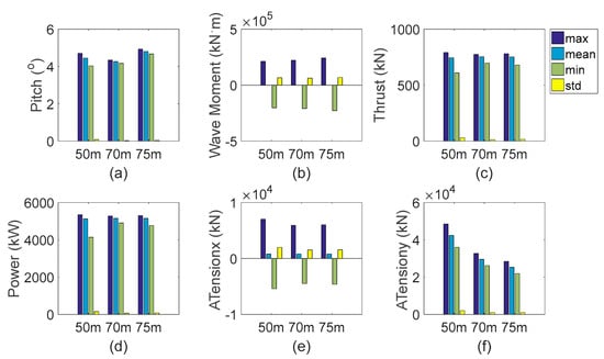 Furthermore, according to the time history curves and spectrum in Figure 7, we see that the standard deviation of pitch motion differs among these AOWTs. The standard deviation is representative of the oscillation amplitude around the new equilibrium position. By comparing the results among these conditions, it is seen that the oscillation of the 50 m depth AOWT is much larger than the other ones. On the other hand, the response spectra of the 70 m and 75 m depth AOWTs agree well with each other, even though the dominant responses of the 70 m depth AOWT, such as low-frequency and wave-frequency response, are slightly lower than those of the 75 m depth one.