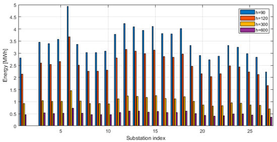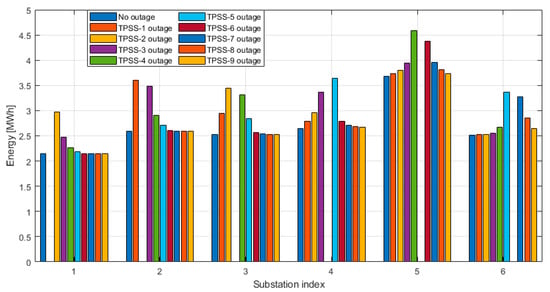 - The maximum energy consumption occurs at TPSS-6 for the cases which are shown in red. This denotes that TPSS-6 could consume more energy than others for most cases. This is consistent with the fact that the rated tractive power of TPSS-6 is 3 MW × 2, which is higher than other the TPSS;