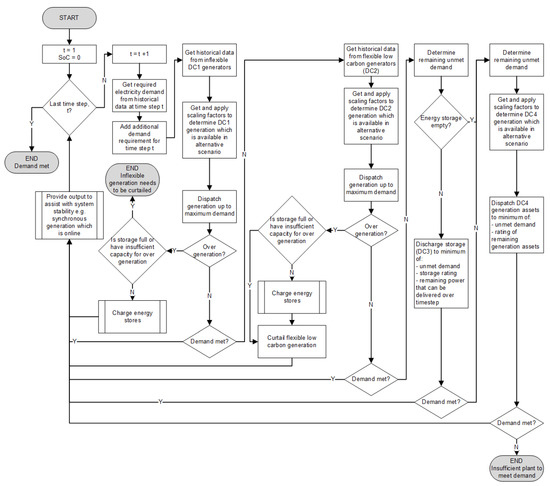 If the demand is not met by inflexible plant, then more flexible low carbon generators (DC2) are dispatched to maximize their contribution to energy and decarbonization. The available generation is determined using historical generation data and simulations as described in Section 3. If DC1 and DC2 exceed demand, then energy storage charging can occur using overgeneration. If the storage is full, then DC2 assets are curtailed. If DC2 assets are insufficient to meet the demand of a particular time step, then DC3 assets are dispatched—this class includes energy storage assets as described in Section 2.1. If DC3 assets have exhausted their storage capacity or if they have insufficient capacity, then DC4 assets are dispatched. DC4 assets are low priority/last to dispatch assets such as peaking plant in a traditional market or potentially fossil fuels in a market with a high carbon price. These assets provide electricity to avoid brownout issues during shortages in electricity generation from DC1, DC2 and DC3.