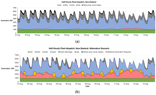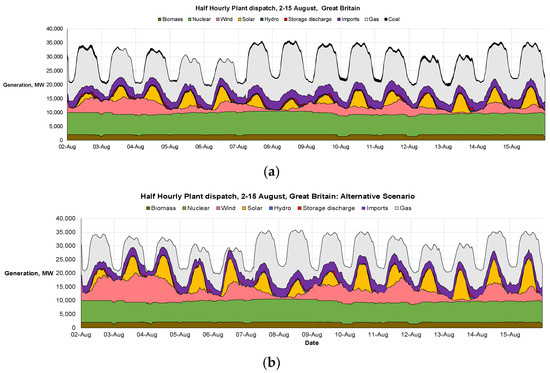 (a) Historical and (b) alternative electricity mix in Great Britain 2–16 August 2017 through application of the method proposed in this paper. Generation is in order of dispatch class. The alternative scenario represents a scenario 7.5 GW of additional wind and solar PV.
