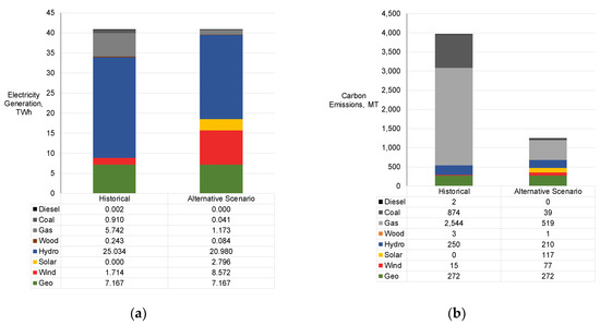 (a) Annual historical and alternative electricity mix in New Zealand and (b) projected carbon emissions from electricity generation with an additional 2.0 GW of wind and solar PV.