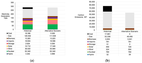 The same scenario is next applied over the full annual dataset. The annual electricity mix and carbon emissions are shown in Figure 3a and b respectively. Figure 3a shows that the wind and solar generation reduce fossil fuel use to less than 2% of electricity generation over the year. Here, the majority of greenhouse gas emissions were still attributable to coal and gas (Figure 3b), despite these providing less than 17% of annual electricity. In the alternative scenario coal and gas are not completely eliminated due to insufficient stored hydro, wind or solar to meet demand at certain times (as shown in Figure 2b). However, the consequence of reducing fossil fuel use lowers overall emissions by 69% with the simulated growth in renewable generation. The reduced annual hydroelectricity generation requirement in the alternative scenario also means that the system is less exposed to lower reservoir levels in dry years such as that which occurred in 2017/18 [35] by keeping water in the hydroelectric reservoirs. The impact this has on utilization of fossil fuels is explored in Section 4.5.2