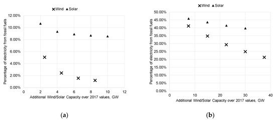 The results show wind and solar investment can have a significant impact towards decarbonization of both electricity systems, despite inherent variability of both generation sources. In New Zealand, a modest wind and solar growth could mean that 99% of present electricity demands can be met from low marginal carbon/renewable sources with consequent reduction in greenhouse gas emissions. The results show, for New Zealand, +2.0 GW of wind and 2.0 GW of solar reduce DC4 assets to less than 2% of supply which contrasts with the work of [17] which used additional geothermal generation and a similar amount of wind to achieve a similar result. To consider how small an increase in low carbon generation this is, it is equivalent to 15.9% of the solar and 13.6% of wind generation installed in the UK at the end of December 2017 [23]. In Great Britain, wind and solar also have an impact on decarbonization and displacement of gas and coal plants, although this is less impactful than in New Zealand in the range considered in this paper—possibly due to wind generation in New Zealand having a more consistent monthly capacity factor (Figure 9).