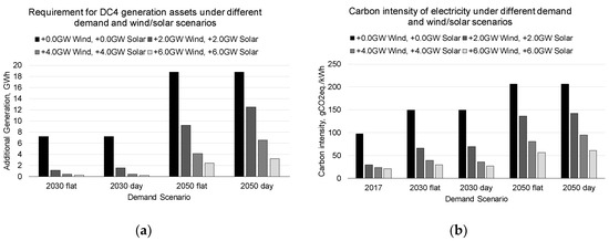 A sensitivity analysis has been performed of different electricity demand scenarios in New Zealand (Figure 7). As expected, this shows that increased demand means additional low carbon generation is required. In the scenarios assessed, the additional DC4 generation requirement is found to be lowest when the demand is spread over 24 h rather than a daylight load only due to the availability of wind for overnight load in the model data. However, smarter demand profiles which more closely align demand to generation of intermittent electricity could be valuable. The results for New Zealand are particularly interesting in the context of the Interim Climate Change Committee report which investigated a 100% renewable approach by overbuilding wind and solar generation, energy storage and demand response [40]. The results of this paper support an increased investment in wind and solar but also quantify the reduced requirement and deployment of backup assets. This should be considered when investigating the economic and carbon benefits or otherwise of “backup” assets in work such as [41].