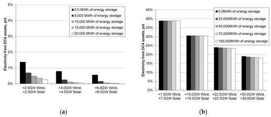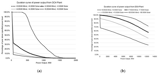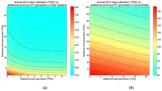 Annual energy requirements from DC4 assets under increasing wind and solar penetration—Applied to (a) New Zealand and (b) Great Britain (fossil fuel based only).