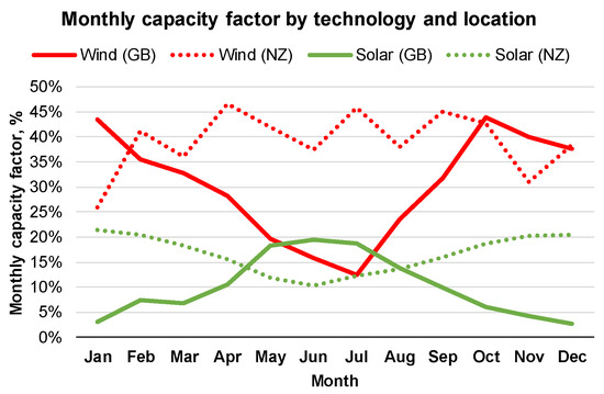 Capacity factor of wind and solar generation as modelled for New Zealand and Great Britain. Trends mirrored in (Ministry of Business, Innovation and Employment, 2019) (Ministry of Business, Innovation and Employment, 2019).