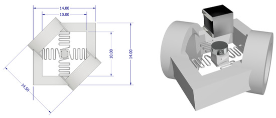 The harvesters were designed using Inventor software (Autodesk, San Rafa, CA, USA). The external dimensions of the device were the same for all considered internal designs (Figure 1). The internal structure consisted of a seismic mass with a place for small commercial permanent neodymium magnets (1.5 mm in diameter, 1 mm high, Webcraft, Germany). One or two magnets were positioned on the sides of the vibrating microstructure. The seismic mass was suspended on springs (various designs) with thicknesses of 200 μm or 400 μm. The internal structure volume, called the active volume [35], was taken into account in the calculation of the generated power density. At a distance of 2 mm above the magnets, a commercially available miniature surface-mounted coil (SMD 812 with 7.36 mH inductance) was positioned in a printed holder. The output voltage from the coil was connected to a measurement setup. The scheme of the harvester and a computer visualization of one of the designed harvesters with a magnet and coil is shown in Figure 1. Simulations of the natural resonance frequency of the vibrating structure with magnets were carried out using Inventor software (Autodesk, San Rafa, CA, USA). The simulations were conducted for an acrylonitrile butadiene styrene-like material with a Young’s modulus equal to the printing material’s data sheet (E = 1423 MPa) and test structures measured by us.
