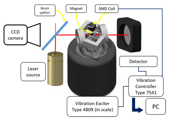The measurement setup consisted of a vibration controller Type 2718, a power amplifier Type 2718, a vibration exciter 4809 (10–20 kHz) with a set constant acceleration (1 g), a digital oscilloscope, a laser source (635 nm, 5 mW) with a power supplier, and a photodetector (OP101, Thorlabs) (Figure 2). The electrical output of the harvester was connected to a loading resistance in the range of 10 Ω to 2.4 kΩ to measure output power vs. loading resistance characteristics. Despite collecting the electrical signal from the coil, the optical detection systems (laser and photodetector) were used to determine the resonant frequency of the vibrating microstructure. A charge coupled device (CCD) camera with a video grabber and USB connection (2 megapixels, HDCE-X2, Poland) observed the harvester during operation to monitor the operation of the vibration structure and determine the displacement of the vibrating seismic mass. It captured images at 30 fps. LabView-based home-made software was used to collect the images and analyze for displacement analysis. The optical detection system was calibrated on a certified scale with 100 μm distance marks. It was determined that 91 pixels corresponded to 100 μm length and the accuracy of the measurement technique was ±2 pixels/±2.6 μm. The software counted the difference in the number of pixels for a non-vibrating mass (initial position) and a mass vibrating at resonant frequency.