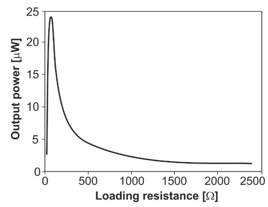 Output power generated by the energy harvester as a function of loading resistance, result for optimal geometry of the 3D-printed microstructure (Table 1).