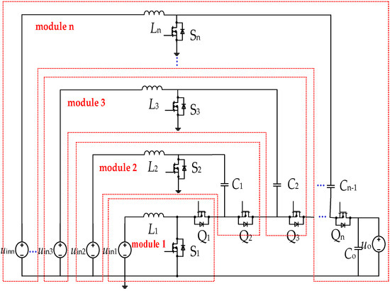 - Discharging Mode (Boost): during a switching period Ts, S1, S2, ..., and Sn interleaved with 360°/n phase shift are turned on with the duty cycle greater than (1 − 1/n), and Q1, Q2, ..., and Qn are turned off. Charging Mode (Buck): during a switching period Ts, Q1, Q2, ..., and Qn interleaved with 360°/n phase shift are turned on with the duty cycle less than 1/n, and S1, S2, ..., and Sn are turned off.