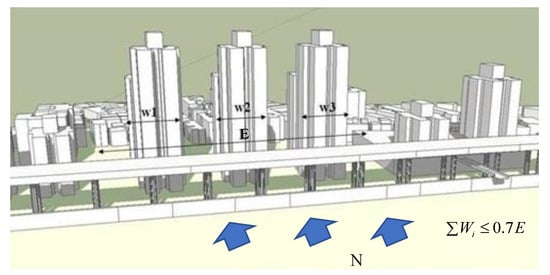 Figure 1. High-rise building façade width limited by the urban design specification (redistricted zone on the north side of Banqiao Jiangcui in New Taipei City, Taiwan) (Wi = maximum width of the façade of each high-rise building; E = average width of the construction site). - (2)