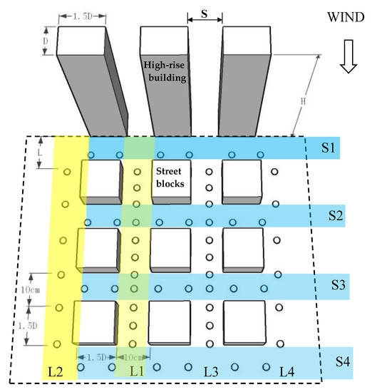 In this study, a reduced-scale (1/250) stiff test model was used. Figure 2 schematically shows the tested model (please also refer to Figure 3c) and the locations of the wind-speed measuring points. The dimension of each street block, the distribution pattern of the street blocks (a 3 × 3 checkerboard-type pattern) and the width of the streets (10 cm) in the downstream area (the area within the dotted rectangular box in Figure 2) were fixed. There were three variables: S, H and the distance (L) between the high-rise buildings and the first-row downstream street blocks (i.e., the width of the street S1). Based on their vertical and horizontal directions, the streets are labeled downwind streets (L1 and L2) and transverse streets (S1–S4).