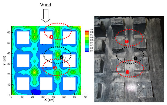The flow field in an urban street canyon exhibits a complex flow pattern that is affected by the near-field buildings. In this study, the airflow pattern and the cause of formation in the street canyons is observed based on the wind-speed measurements with the help of oil film testing. In the oil film test, the oil (70% Kerosene; 10% Oleic acid; and 20% Titanium dioxide powder) was evenly spread on the model and ground surfaces. When the wind blows the oil film, the airflow pattern near the surfaces of the objects can be observed from the change of the oil film, as illustrated in Figure 3a (right). The higher the wind speed, the more the oil film can be driven; a lower wind speed will still let the white oil film accumulate.