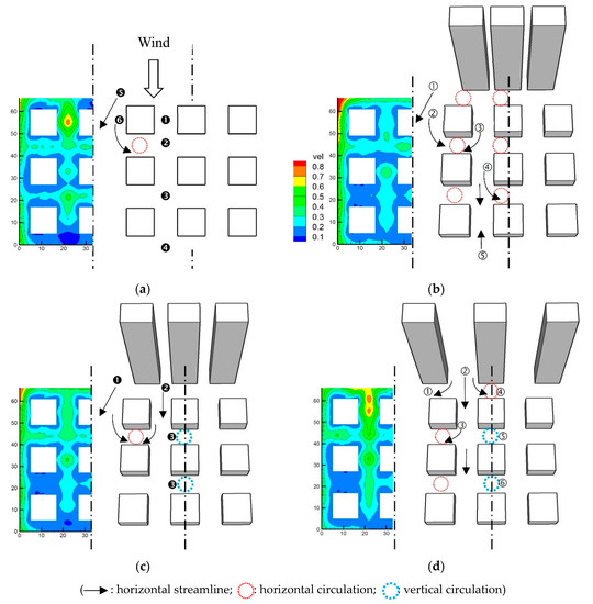 Figure 5b shows the wind-field distribution in the presence of high-rise buildings with an S/D value of 0.375. Because the high-rise buildings were arranged in a relatively dense pattern, their effects on the downstream study area were similar to those of a resistance flow [6]. It shows a strong-wind region located at corner ① on the outer side of the high-rise buildings. Due to the resistance from the high-rise buildings, the Vel in downwind street canyon L1 was even lower than that in Figure 5a. Additionally, the Vels in the transverse street canyons S1–S4 were also lower than those in Figure 5a. There was different cause for the formation of low-speed circulation in the transverse street canyons. The horizontal circulations (red dotted circles in Figure 5b) in the transverse street canyons between L2 and L1 were formed from airflows ② and ③, which whirled into the street canyons. The circulations in the transverse street canyons between L1 and the central axis of symmetry were formed from airflow ④, which whirled into the transverse street canyons. On the other hand, after the approaching flow passed over the top of the high-rise buildings, a downwash airflow ⑤ was formed, which met with the stream-wise flow that moved in the opposite direction on the third-row street canyon (S4–L1). This led to a relatively low Vel at this location.