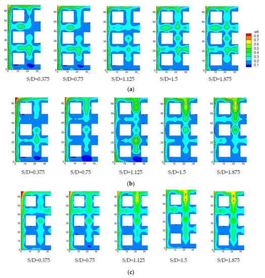 Figure 6a shows the airflow velocity (Vel) distribution in the study area at various S/D values when H/D = 1 (H/D = 1 means that the upstream high-rise buildings and the buildings in the downstream building cluster were of the same height). Due to the lack of airflow at the corner of the high-rise buildings and the high-rise buildings’ channel effect, the Vels in Figure 6a were relatively low, overall. Figure 6b,c show the Vel distribution when H/D = 3 and 7, respectively. As H increased, the strength of the circulation at the corner gradually increased. At a small S, a wind field with a Vel over 0.8 appeared at the corner. As S increased, due to the strengthening of the channel effect, a high-wind speed region appeared in the upstream area of the downwind street canyon.