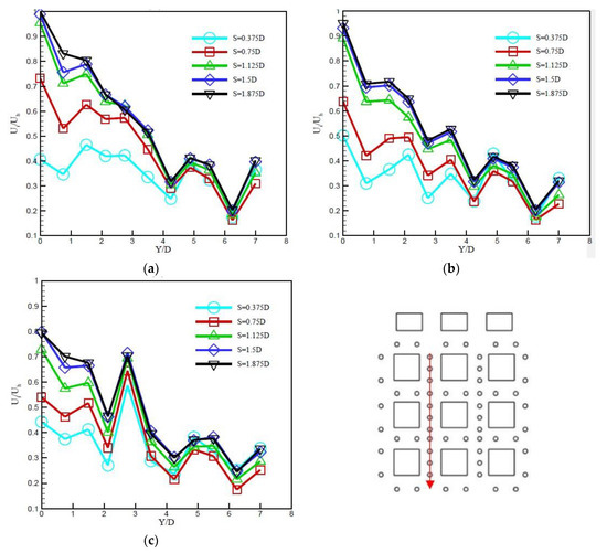 Here, the effect of L (i.e., the distance between the high-rise buildings and street block S1) is considered. When L/D = 0.75 and 1, the Vel variation in the downwind street canyons exhibited relatively similar trends. However, when L/D = 1.5 (Figure 7c), Vel increased suddenly at measuring point 5, and then decreased sharply further downstream. This high local Vel occurred because the street canyon formed by the buildings between street canyons S2 and S3 caused further flow field channelization.
