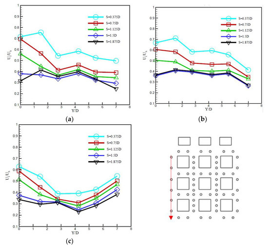 Figure 7a shows that when S/D = 0.375 (represented by symbol O), because the three high-rise buildings (H/D = 7) were in close proximity to each other, they exerted a shelter effect on the downstream street canyons. As a result, the Vel generated in downwind street canyon L1 was relatively low. As S/D increased to 0.75, Vel in street canyon L1 increased somewhat, in particular between street canyon measuring points 1 and 6. As S/D increased to 1.125, 1.5, and 1.875, Vel at the entrance of street canyon L1 was near 1. As S increased, Vel in the upstream area of street canyon L1 increased, whereas Vel in the downstream area of street canyon L1 was relatively low, and there was no significant difference between the scenarios.