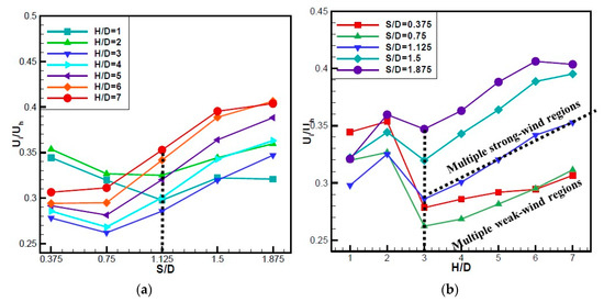 Figure 9 shows the relationships of S and H with Vel (Ui/Uh, calculated for all measurement points) from gathering all the measured data. Figure 9a shows that the Vel variation trend differed between H/D = 1–2 and H/D = 3–7. When H/D = 1–2, Vel varied relatively gently between 0.3 and 0.35. In comparison, Vel varied relatively sharply when H/D = 3–7. The greater the H or S was, the greater too was the Vel in the downstream street canyons. Figure 9b shows that when H/D ≥ 3, the Vel curve transitions at an S/D value of 1.125. When S/D > 1.125, multiple strong-wind regions might be formed. Under this condition, it is necessary to evaluate whether pedestrian-level gusts could be generated in certain regions or at certain street corners. When S/D < 1.125, multiple weak-wind regions might be formed. Under this condition, it is necessary to evaluate ventilation issues resulting from poor outdoor airflow.