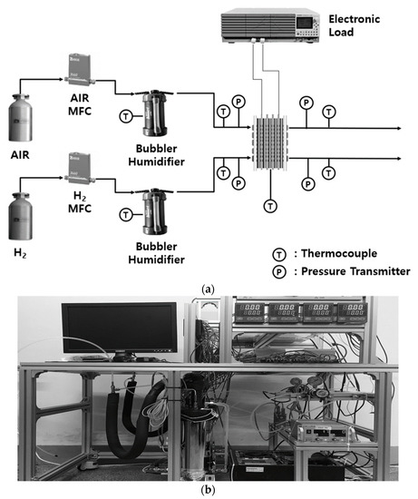 The fuel cell (unit cell, CNL) was assembled by arranging gas diffusion layers (GDLs) (39BB, SGL) sequentially with MEA (VFM-P25P-N, Vinatech) between graphite plates that were formed with a serpentine flow path, and then fastened under constant pressure. MEA, the geometric area of the electrode was 25 cm2, with Pt loading of 0.4/0.4 mg/cm2 (anode/cathode). The experiment was conducted with a single cell, and performance of the cell was evaluated using electronic load (PLZ664WA, Kikusui). Hydrogen and air were controlled at a constant flow rate through a mass flow controller (MFC, Sehwa High Tech), humidified through a bubbler (CNL) and supplied to the fuel cell. The temperature of the gas was controlled by surrounding the pipe with heating tapes. The heating tapes were connected to the indicator (HX9, Hanyoung Nux) to maintain the operating temperature. Thermocouples were installed at the inlet of the cell, middle of the cell, outlet of the cell and humidifier line. Seven indicators precisely control the temperature of the gas. The error was ±0.5%. The gas was humidified through the bubbler. The heating tapes were wound outside the bubbler, and the thermocouple was located at the middle of the bubbler. The relative humidity was determined through comparison between the gas temperature and the bubbler temperature. The gas pressure at the fuel cell inlet and outlet were measured. A schematic of the PEM fuel cell experiment and photograph of the experimental equipment are shown in Figure 2a,b respectively.
