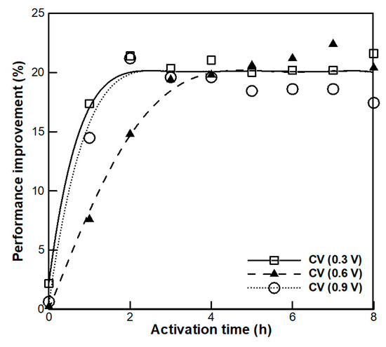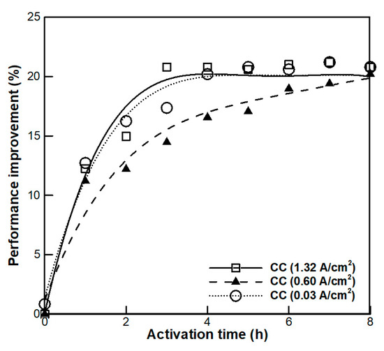 Experiments on CC mode conditioning were conducted under various current conditions. The operating temperature was kept constant at 80 °C. In the case of CC mode conditioning, time required for complete conditioning is shown in Figure 3. Performance improvement (PI) was calculated as follows: