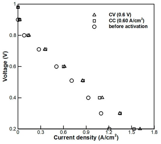 In order to investigate the condition of the fuel cell, experiments were conducted in the order of CC mode followed by CV mode. Since the hydration of the membrane is important for conditioning [8,21], the experiment was conducted at 100% relative humidity. First, in order to know the end point of conditioning, a membrane conditioning experiment was performed in various ways. It was determined that the conditioning was terminated when the current value at 0.6 V was 20% higher than the initial current value; this process is hereafter referred to as ‘complete conditioning’. In the case of the CC mode, three experiments were conducted at 0.03 A/cm2, 0.60 A/cm2 and 1.32 A/cm2, respectively. In the CV mode, experiments were performed at 0.3 V, 0.6 V and 0.9 V, each (with the highest voltages being at 1.32 A/cm2, 0.60 A/cm2, 0.03 A/cm2, respectively). The stoichiometric number was 1.5 at the anode and 2.0 at the cathode, respectively. The fuel cell performance was measured every 30 min. In this way, we compared CC and CV mode conditioning, following which the optimization of the conditioning process was developed by varying the temperature. The optimal conditioning method was then selected based on economic efficiency.