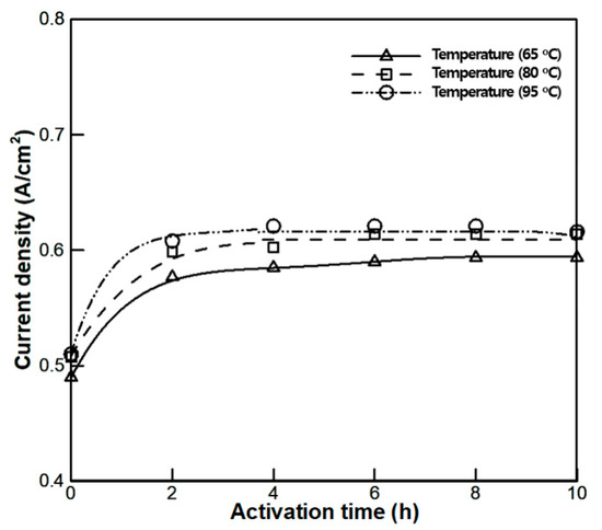 In order to investigate the effect of operating temperature on the conditioning process, experiments were conducted at 65 °C, 80 °C and 95 °C, respectively. It was confirmed through the experiment described in Section 3.1 that the CV mode is more effective than the CC mode in the case of conditioning. Based on this finding, further experimentation was conducted in the CV mode with the conditioning voltage of 0.6 V. Because conditioning was relatively slow at 0.6 V, we found significant differences on varying the temperature. As shown in Figure 7, the time required for complete conditioning was 4 h at 95 °C, 5 h at 80 °C and 8 h at 65 °C, thereby indicating that the fastest conditioning was achieved at 95 °C. This is because as the temperature increases, the electrochemical reaction becomes more active and this can be explained by examining the behavior of the reversible thermodynamic potential depending on temperature, as shown in the Nernst Equation: