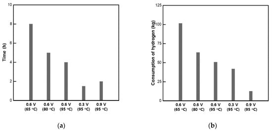 Economic analysis on the conditioning process was conducted to confirm the advantages of our suggested conditioning method by comparing it with previous methods. To this end, we analyzed the amount and cost of hydrogen used for conditioning a 135 kW PEM fuel cell stack (i.e., the same class as Hyundai’s NEXO). The elapsed time and consumption of hydrogen required to reach complete conditioning are shown in Figure 8. Moreover, the cost of hydrogen required for complete conditioning for each method is shown in Table 3. The newly proposed optimized conditioning method, i.e., conditioning based on the CV mode at 0.9 V with an operating temperature of 95 °C, was compared with conditioning based on the CV mode at 0.6 V with the operating temperature of 65 °C which was performed by Ko et al. [3]. For that study, approximately 101.54 kg of hydrogen were used for conditioning at 65 °C in the CV mode at 0.6 V. However, when conditioning at 95 °C in the CV mode at 0.9 V, only approximately 12.7 kg of hydrogen was used. Therefore, the optimized conditioning method reduced the consumption of hydrogen during conditioning by approximately 87.5%. Furthermore, the cost of hydrogen required to complete the conditioning process was also decreased by 955,622 KRW based on the current price of hydrogen in Korea [28]. Moreover, as shown in Table 4, the cost of hydrogen required to complete conditioning was also decreased by 1,243 USD, 97,734.12 JPY and 844.07 EUR based on the current hydrogen prices in the USA, Japan and Germany [29,30], respectively. This study intends to contribute to securing market accessibility by suggesting an optimal method of conditioning using the CV mode at 0.9 V with an operating temperature of 95 °C, to help save the unit price of fuel cells as discussed.