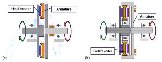 Dual rotor axial flux machine solutions: (a) single permanent magnet (PM) exciter disk and single armature disk; (b) two PM exciter disks and single armature disk.