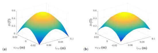 where is the slot pitch and is the air gap flux density distribution factor as a ratio between the average and maximum value of the air gap flux density. The machine has coreless armature and relatively high value of PMs height in reference to pole pitch. Because of that, the air gap flux distribution along the width () and the length () of the PM is close to sinusoidal and can be defined as:
