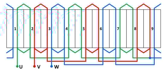 where is the magnetic relative permeability of PM, is the PM fill coefficient (defines the ratio between PM volume and PM specific material in that volume) and is the remanence flux density of the PM. Figure 6 shows the winding construction of the designed machine.