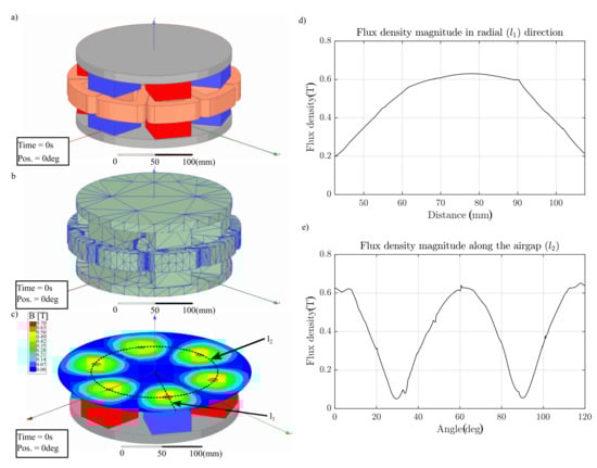 FEM analysis of designed machine: (a) geometry view in Ansys Maxwell 3D, (b) finite elements discretisation of the geometry, (c) example of the results—flux density in the middle of the coreless armature, (d) flux density in the radial direction (along ), (e) flux density along the air gap at the middle of PM (along ).