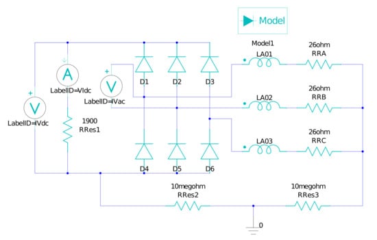 For the model verification, a transient simulation of the designed machine was conducted. For this simulation, a circuit model was defined in ANSYS Maxwell software. Figure 8 shows the circuit model. The winding resistances RRA, RRB and RRC have been calculated based on the design demotions of the machine coils. A series of simulations in which the machine velocity and the load resistance RRes1 were changing have been conducted. The differential velocity changed from 100 to 1000 rpm and the load resistance changed from 100 to 1900 ohms