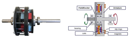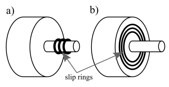 One of the key aspects apart from the mechanical decoupling between both rotors was the issue of the electrical energy transfer between the armature rotor and the terminal box of the generator. Generally in AC machines, a set of slip rings is used to supply or draw power from the rotating part of the machine, whether it is a synchronous machine with DC excitation winding on the rotor supplied via two slip rings or it is an ac induction machine with three phase wounded rotor and three slip rings. Usually, the slip rings are placed side by side on the shaft of the machine (Figure 10). In the case of the proposed dual rotor axial flux machine, the slip rings are in the form of concentric rings to which the brushes are spring-loaded parallel to the axis of the machine. The advantage of this approach is the smaller overall length of the machine, however, the disadvantage is the increase in the mechanical losses due to the friction in slip rings and much larger diameter of slip rings than in typical ac machines.