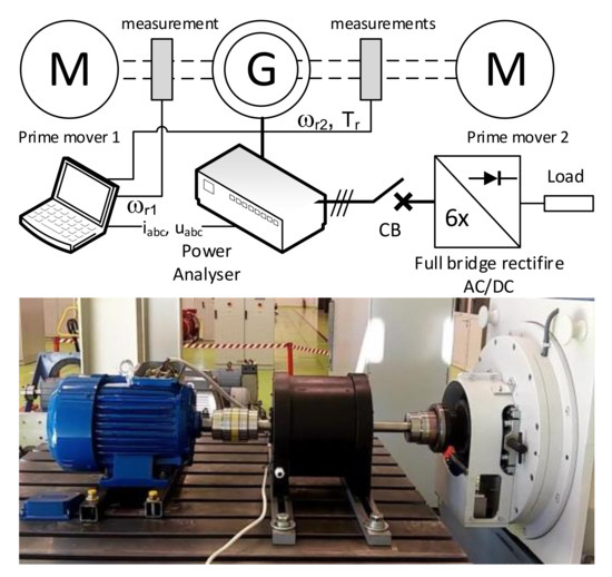 The experimental analysis of the prototype generator has been conducted in the laboratory. The dynamometer test stand equipped with HBM T40B type of torque sensor was used in the measurements. In addition, a second motor equipped with an encoder for speed measurement was used to move the second rotor of the generator. The electrical parameters of the generator were measured using a ZES LMG670 type of power analyser. Figure 11 shows the simplified measurement test stand schematic and dual-rotor generator test on the dynamometer test bench.