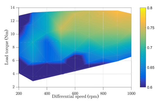 Conducted measurements included the back EMF waveform measurement of line-to-line voltage of the generator (Figure 12). Also, the efficiency of the prototype generator was measured for selected differential speeds between the rotors and selected load conditions. Figure 13 shows the measured efficiency of the prototype generator.