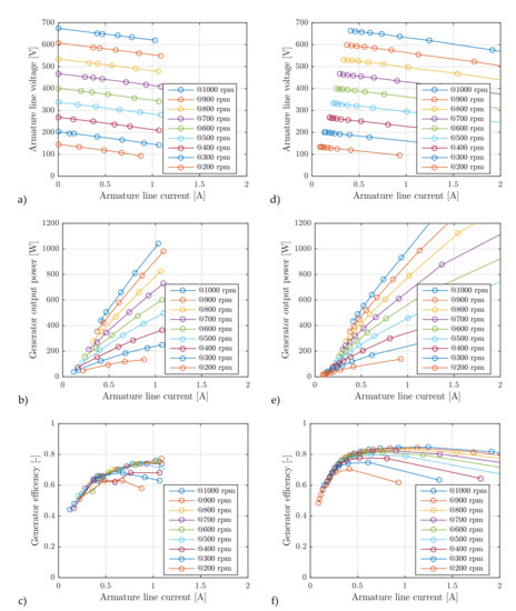 FEM simulation and measurements results: (a) measured machine voltage, (b) measured machine output electrical power, (c) measured machine efficiency, (d) simulated machine voltage, (e) simulated machine output electrical power, (f) simulated machine efficiency.