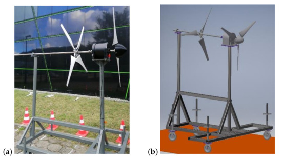 Permanent-magnet dual-rotor generator coupled with counter-rotating wind turbine for efficiency wind research: real photo (a), virtual model (b).