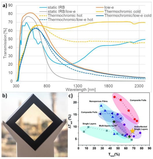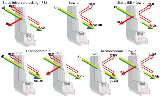 Current commercially available energy-efficient glazing solutions are static systems. They are either developed to regulate the solar heat gain of windows through blocking of infrared (IR) light (Figure 1a), or to reduce radiator heat loss through the window (Figure 1b). Therefore, static solar infrared blocking (IRB) glazing has its highest efficiency in hot climates, and low emissivity (low-e) glazing, which reflects longer wavelength infrared radiation, has its highest efficiency in cold climates. There are systems that combine static IRB with low-e to exploit the benefit of both systems (Figure 1c), but, due to the reduced solar heat gain of these glazing systems, there is still room for improvement in climates with increased heating demands. Especially in climate regions with hot summers and cold winters, adaptive systems are required, that are able to change their properties depending on the requirements of the building and the weather conditions. Therefore, current research and development focusses on glazing systems that can switch their visible transmission and/or solar heat gain depending on an external stimulus, such as electrochromics [,,] and thermochromics [,,].