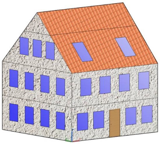 In real life, the number and dimensions of windows and the building materials differ for each geographical location presented in this article. In our work, however, we aimed to study the impact of the different glazing systems on the energy consumption for a variety of geographical locations, and therefore studied the same building for all locations. In line with a recently reported study by Aburas et al., we have selected 25% windows in facades as model for residential buildings []. The system modelled in this study is a three-story residential building with a floor area of 64 m2, a building height of 9 m, a roof pitch of 45°, and 25% of the building surface covered by windows (Figure 2). Therefore, each floor was constructed in Energy Plus as a single thermal zone with external dimensions of 8 m × 8 m × 2.5 m, with four windows of 1 m × 1.25 m for each wall of the ground and first floor, and for the second floor with adjusted window surface area, taking into account the roof pitch to reach a total of 25% (Figure 2). The building is placed in a way that each external wall is facing one cardinal direction and is exposed to the external environment (weather, sun, wind, etc.). The ground temperature is set to reflect the real local ground temperature and is in contact with the floor area of the ground floor. All internal surfaces are modelled to enable interzone heat transfer. For walls, floors and ceilings, materials were selected in line with a previous study by Warwick et al. []. Note: For a more accurate estimation of the reduction in energy consumption and cost savings per m2 thermochromic window in the Netherlands, other building types, such as terrace houses, which are common in the Netherlands, should also be studied.