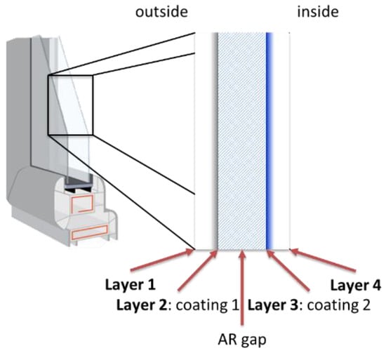 Schematic depiction of double glazing windows modeled in Energy Plus with positions of possible energy-efficient coatings and argon gap.