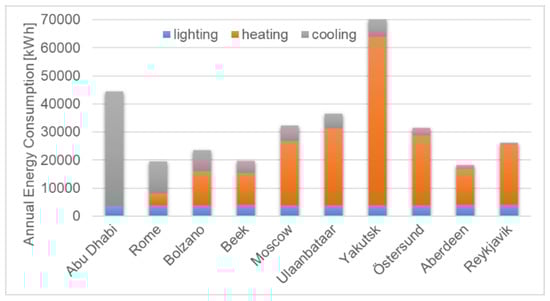 We selected 10 different locations across various climate zones, ranging from hot over intermediate to cold climates, for modeling the energy consumption of the residential building. To select locations with different ratios of heating and cooling demand over the year, we first modeled the annual energy consumption due to heating, cooling and lighting of the residential building with double clear glazing. Afterwards we compared the heating and cooling demand for each location (Figure 5) and chose for this study (i) a hot location with only cooling demand over the year (Abu Dhabi/UAE), (ii) a hot location with annual cooling demand being 3 times the annual heating demand (Rome/Italy), (iii) four locations with warm to intermediate climates where the annual heating demand equals 2–5 times the annual cooling demand (Bolzano/Italy, Beek/Netherlands, Moscow/Russia, Ulaanbaatar/Mongolia), (iv) three locations with intermediate to cold climate where the annual heating demand is 10 times the annual cooling demand but with difference in temperature spread over the year (Yakutsk/Russia, Östersund/Sweden, Aberdeen/Scotland), and (v) a cold climate location with almost no cooling demand (Reykjavik/Iceland; Table 2). These 10 regions were selected to represent all climate zones in the northern hemisphere, including extreme climates with either solely heating or cooling demand, and climates with both extreme temperatures in summer as in winter. Using all these locations in our study on energy performance of the 5 selected representative energy-efficient glazing solutions enables us to give adequate advice on which glazing solution to choose at all different climates across the northern hemisphere.